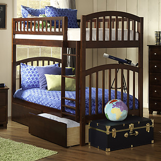 The Richland Bunk Bed's arch and slat design, gives it a classic feel that will surely fit with your child's bedroom style. Designed for durability, the Richland is comprised of Eco-friendly Hardwood and is available in four of our exclusive high build Five Step Finishes. It has a solid mortise and tenon construction with 26 steel reinforcement points and includes two 14 piece slat kits, making box springs and Bunkie Boards unnecessary. The Richland Bunk Bed is available in Twin over Twin and can accept under bed storage drawers or a trundle bed giving you more storage or sleeping space.