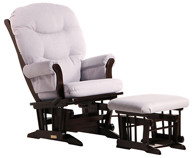 Ideal for nursing or simply relaxing, this Sleigh glider and ottoman combo offers an exceptionally smooth and extra long glide motion with thick cushions and padded arms that will add class and elegance to your decor. The multiposition mechanism locks the glider in 6 different positions and makes it easier to sit in or step out of the glider.There are no sharp edges, the finish is toxic free and this product meets all safety standards.